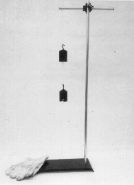 EQUIPMENT: Stand with two weights, three strings, and a pulling bar (hanging from the lowest string), as photographed.