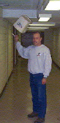 DESCRIPTION: Put some water in the bucket and rotate the bucket in a vertical circle over your head. The centripetal force provided by your arm keeps the water bucket moving in a circle, while the centrifugal reaction keeps the water in the bottom of the bucket, as long as the rotational velocity is sufficient.