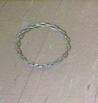 DESCRIPTION: A flexible loop of chain is fitted onto a wheel and set to spin with a high speed AC motor. When the chain is spinning very fast it is carefully worked off the wheel by use of a stick. Once released, the chain has very high rpm's and its rapid motion will cause it to initially slip/skid in place, showing sliding friction without translation. Eventually, the rolling chain will grab the floor and translation from rolling friction will take place. The chain is seen to translate across the floor undergoing pure rotation without slipping like a rigid wheel.