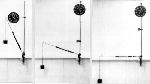 DESCRIPTION: The three configurations pictured may be readily set up and analyzed. The dynamometer measures tension in the rope; an internal spring scale measures the compression in the boom.