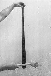 DESCRIPTION: The bat is held at the small end and struck soundly with the mallet at the bigger end. A yellow marker marks the locaion of the center of percussion. When the bat is struck below the center of percussion it will spin out of the holder's fingers moving in the opposite direction to that of the incoming mallet. When the bat is struck above the center of percussion it will spin out of the holder's fingers moving the same direction as the incoming mallet. When the bat is struck at the center of percussion it will rotate about the holder's fingers, but will not spin out of the fingers.