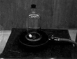 DESCRIPTION: A marshmallow is placed in a bell jar. As the air is pumped out of the jar the pressure inside becomes smaller and the little bubbles of air in the marshmallow increase in size, inflating the marshmallow. Eventually much of the air originally in the marshmallow is pumped aaway. When the air is let back in, atmospheric pressure compresses the marshmallow to a small fraction of its original size.