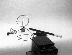DESCRIPTION: A charged rod (black rubber in the photograph is negative) is held near the top plate of the electroscope, causing the electroscope to deflect. While the rod is in this position, the plate is touched by a grounded banana wire, and the electroscope returns to the uncharged position. When the charged rod is pulled away, the electroscope is charged positive, and deflects. This experiment can also be done using a positive glass rod to charge the electroscope negative by induction.
