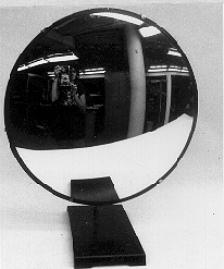 DESCRIPTION: Just observe your image in the mirror. Note that this type of mirror is used in stores, school buses, and other commercial applications. Because it produces an erect and small image, it can be used as the right hand rear view mirr or in a car to see over several lanes of traffic. Because the image is smaller and therefore looks farther away, rear view mirrors carry the warning "Objects in this mirror are closer than they appear."