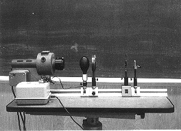 DESCRIPTION: A high-pressure mercury lamp is used to produce a line spectrum. Light from the source is passed through a slit, which is focussed on a distant screen using a 20 cm focal length convex lens. The grating is positioned after the foc using lens.