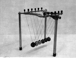 DESCRIPTION: To start, hold one, two, three, or four balls to the side and release. Symmetric oscillations result from conservation of energy and conservation of linear momentum in the collision sequence.