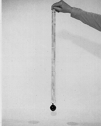 DESCRIPTION: The mass on the spring has a natural frequency, which can be demonstrated by simply holding one end of the spring a rest and allowing the mass to oscillate freely. Demonstrate resonance as follows: (1) With the mass hanging at rest, move your hand very slowly up and down. The mass follows your hand, showing that the mass and the driving force stay in phase for driving frequencies far below the natural frequency of the oscillator. (2) With the mass hanging at rest, move your hand very rapidly up and down. The mass moves opposite to your hand, showing that the mass and the driving force stay out of phase for driving frequencies far above the natural frequency of the oscillator. (3) Move your hand up and down at the natural frequency of oscillation; the phase relationship for resonance is that motion of the driver (hand) must be 90 degrees ahead of the motion of the oscillator. With an almost imperceptible oscillation of your hand, the resonance condition causes the mass on spring to begin to oscillate with a very large amplitude.