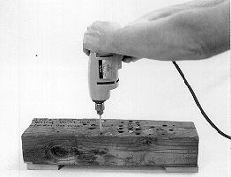 EQUIPMENT: Quarter-inch electric drill, 1/4" dowel rod, soft wood block.