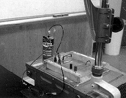 PURPOSE: A compass needle is mounted directly below a wire on a clear plastic sheet which is positioned on an overhead projector. When a current flows in the wire the compass needle lines up perpendicular to the wire, showing that the current-c arrying wire produces a magnetic field perpendicular to the wire. The action is viewed using an overhead projector.