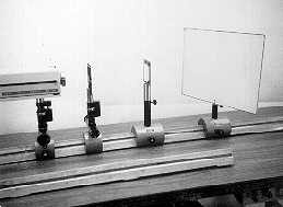 DESCRIPTION: Position variable single slit in holder on cross-carriage in laser beam to obtain diffraction. Pattern can be shown on a distant screen, or the small screen shown in the picture. Magnification with the cylindrical lens can be used as necessary. Spread in the pattern as the slit is closed can easily be seen.